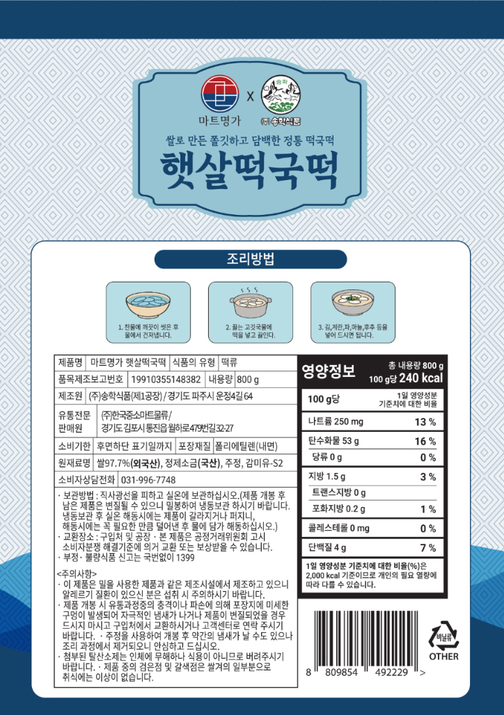 상품명 : PB- 마트명가/송학 햇살 떡국떡 800g